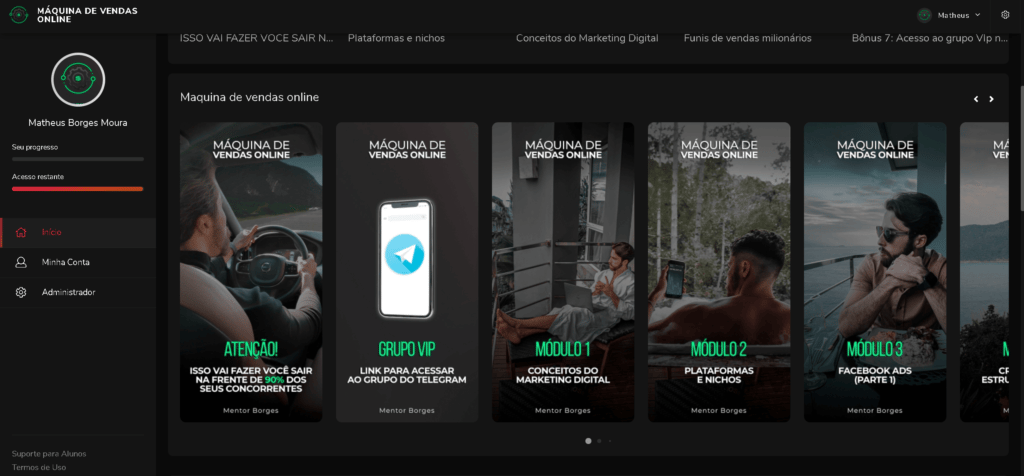 Produtos e Estratégias "Máquina de Vendas": Você irá entender a única estratégia secreta e definitiva que uso para vender cada produto no automático como afiliado e produtor. Além disso, irei te ensinar na prática como escolher o produto certo capaz de te gerar vendas e lucros em escala.